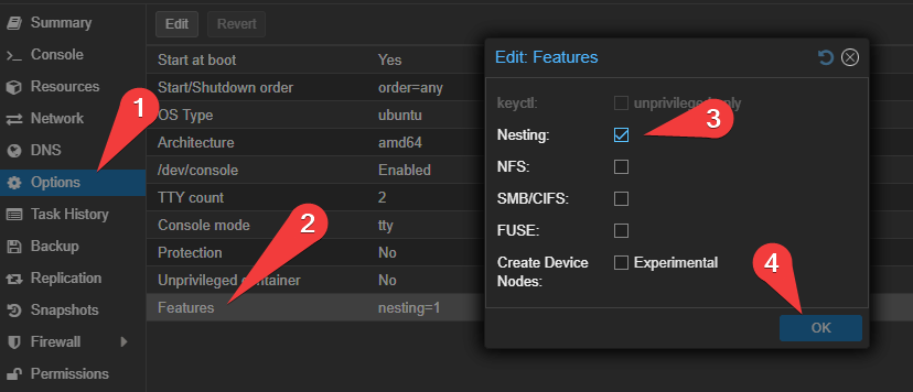 Resolution: Enable ‘nesting’ under Options > Features. Note: Must reboot the container after making the change for it to apply.